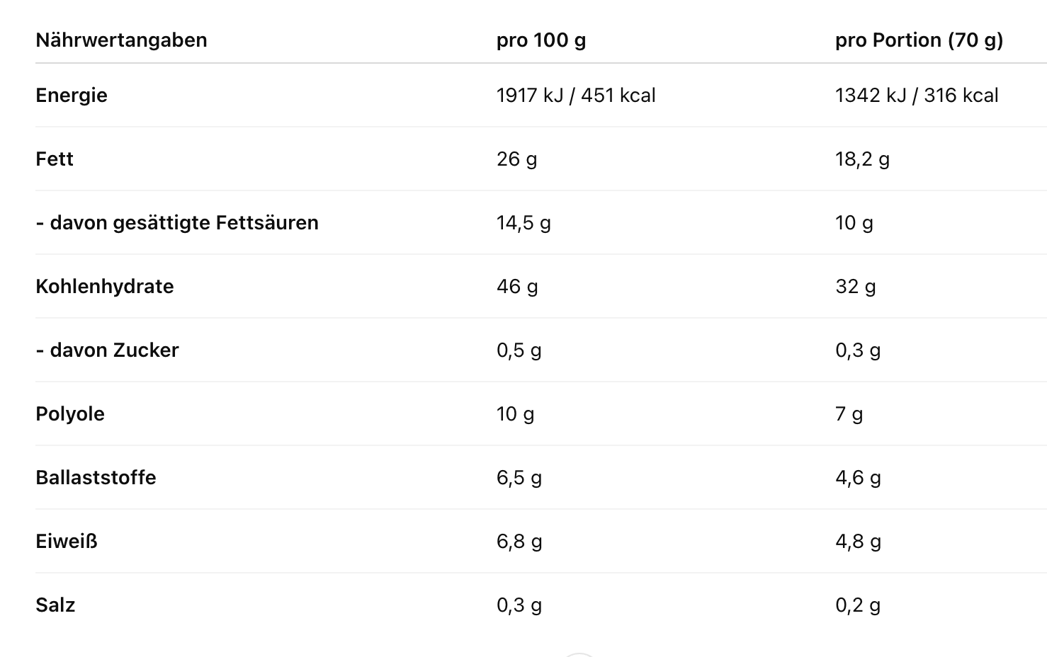 Glutenfreie Mischung (Kartoffelstärke, Maisstärke, Reismehl, Sojafaser, Verdickungsmittel: Guarkernmehl), Chicorée-Inulin (Ballaststoff), Süßungsmittel: Erythrit, Kakaobutter, pflanzliches Öl (Shea-Butter, Kokosnuss), Reismischung (Reisstärke, Reismehl, Reissirup), Sojamehl, Kakaomasse, Kokoscreme, Polydextrose, pflanzliches Öl (Sonnenblume), Orangenöl 0,25%, Emulgator: Lecithin (Sonnenblume), natürliches Orangenaroma, Backtriebmittel: Natriumhydrogencarbonat, Salz, Rosmarinextrakt. Kann Spuren von Erdnüssen, Nüssen, Milch und Sesamsamen enthalten. Enthält natürliche Zucker. Übermäßiger Verzehr kann eine abführende Wirkung haben.