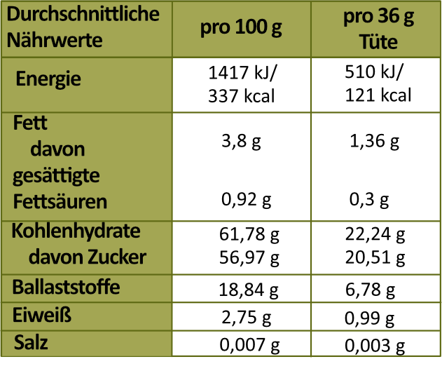 Bereits ca. 36 g decken den empfohlenen Tagesbedarf an Obst eines Erwachsenen und bieten damit eine leckere, nährstoffreiche Alternative zu herkömmlichen Snacks wie Chips oder Gummibärchen – natürlich vegan, regional und voller Fruchtpower.