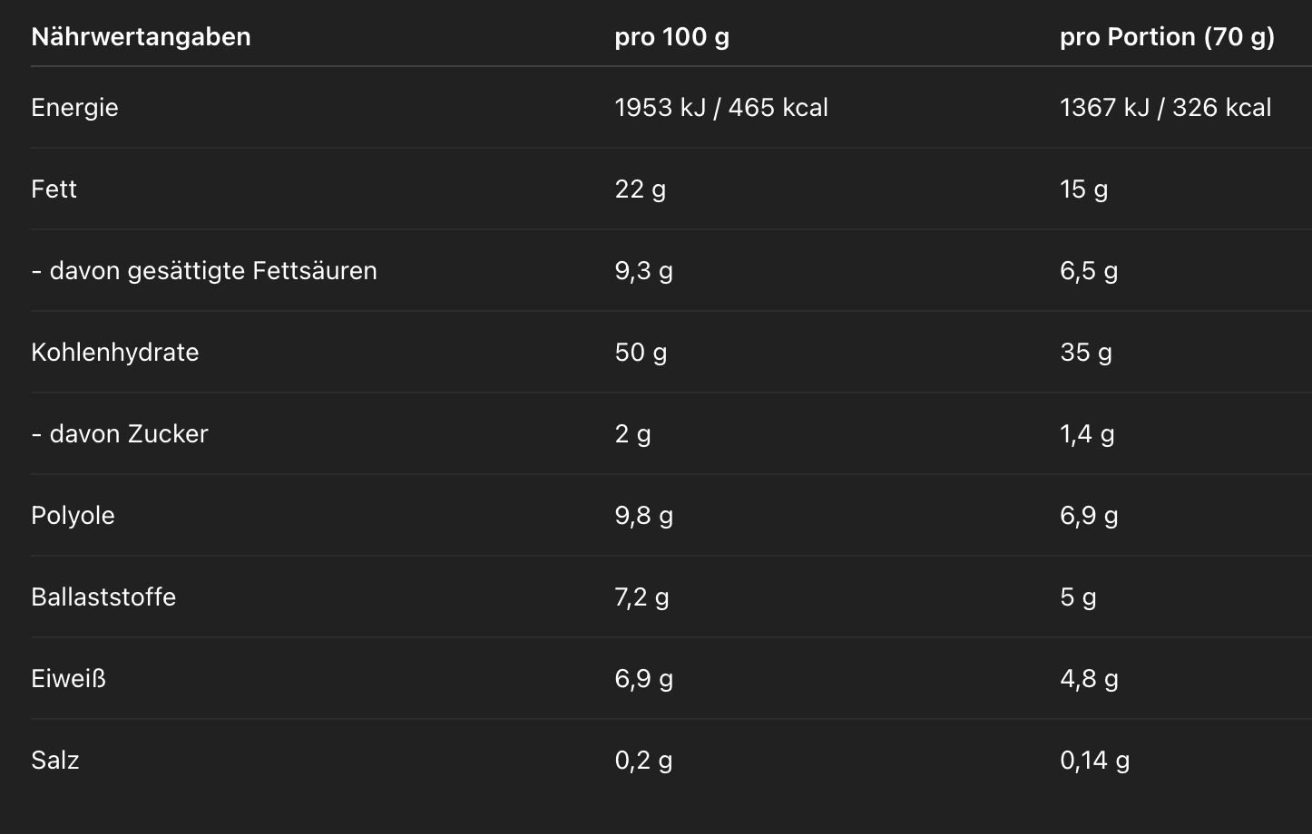 Perfekt als sättigender Snack für unterwegs, vor dem Training oder als gesunde Zwischenmahlzeit. Für besten Genuss kühl und trocken lagern. Übermäßiger Verzehr kann abführend wirken.