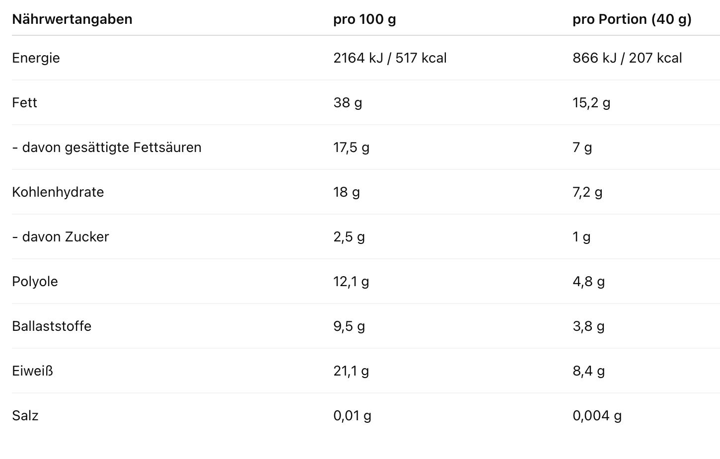 Glutenfreie Mischung (Kartoffelstärke, Maismehl, Reismehl, Sojafaser, Verdickungsmittel: Guarkernmehl), Inulin aus Chicorée (Ballaststoff), Süßungsmittel: Erythrit, Kakaobutter, pflanzliches Öl (Sheabutter, Kokosnuss), Reismischung (Reisstärke, Reismehl), Sojamehl, Kakaomasse, Sojaproteinisolat, Backtriebmittel (Backnatron), Emulgator (Sojalecithin), natürliches Karamellaroma, natürliches Vanillearoma, Süßungsmittel: Sucralose.
